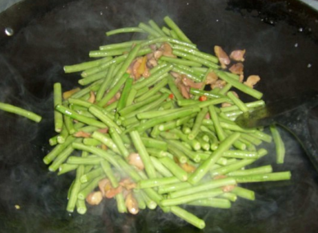 下油,放进辣椒、鸡肾和姜丝煸炒;
