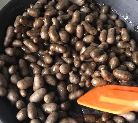 4、加入煮好的山药豆,山药豆要提前放凉,没有水分,不停翻炒。