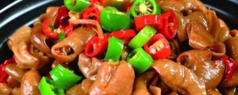 爆炒猪大肠至出多余的猪油,放青辣椒一起爆炒,调味,上碟。