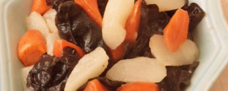 主料:木耳50克、山药150克、胡萝卜150克、橄榄油适量、盐适量、味精适量、葱姜适量。
