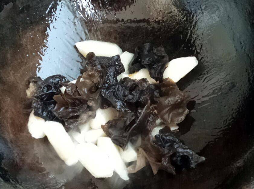 6、木耳入锅炒。