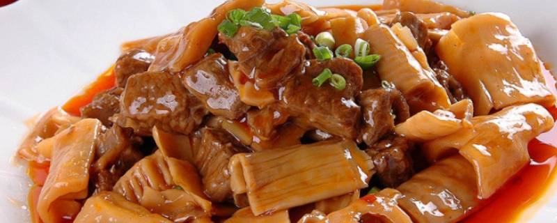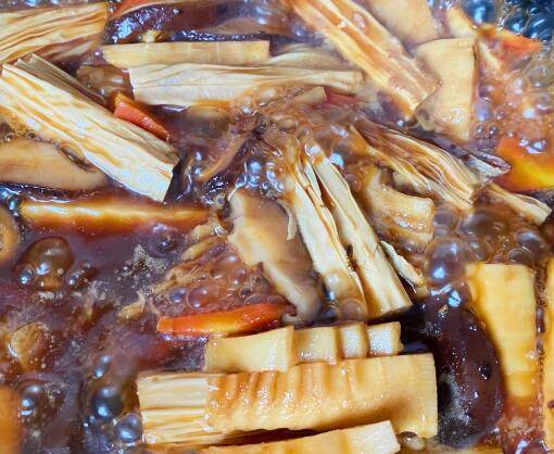 7、倒入腐竹、冬笋、胡萝卜、生抽、蚝油、老抽、糖翻炒均匀。