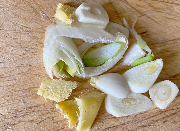 三、腊肉焖冬笋。1、准备食材:腊肉60克、冬笋160克、葱姜蒜适量、青红辣椒适量、盐适量、水适量。