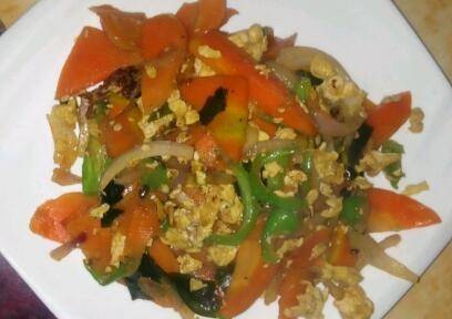 把胡萝卜蒸熟,辣椒洋葱切丝。