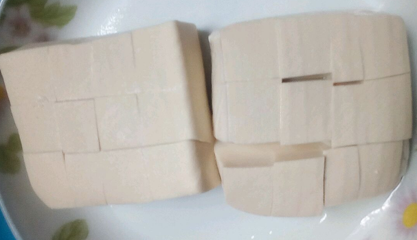 水豆腐放冰箱冻二十分钟,取出在豆腐上划花刀,方便入味。