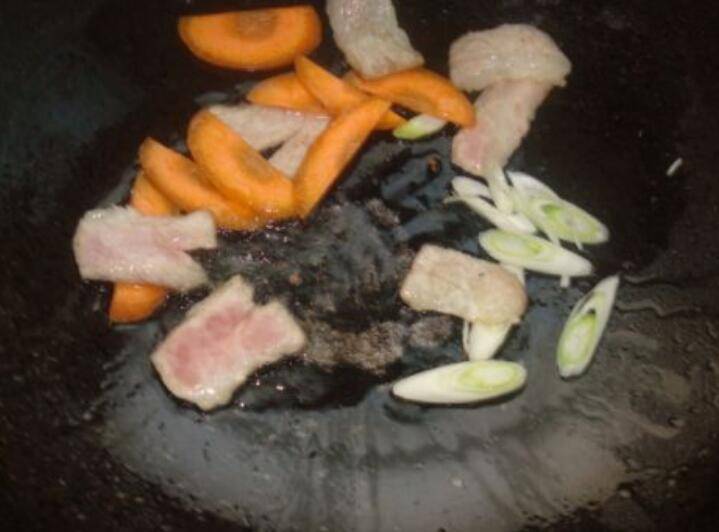 4、放入胡萝卜片、和葱花翻炒一下。