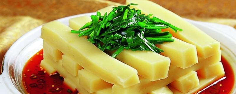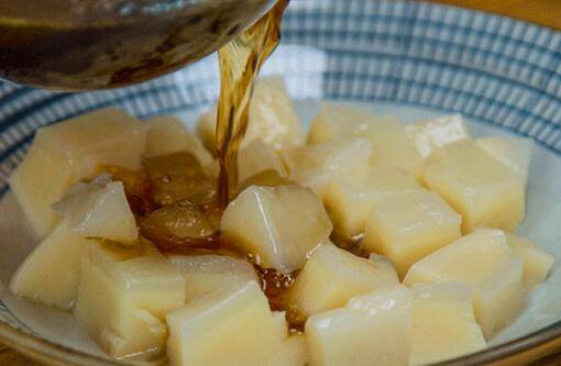 米豆腐放置不烫手后取出来切成小块。再调一碗酱汁, 5大勺水、2大勺醋、1大勺生抽、1小勺花椒油、1小勺盐,搅拌均匀浇在米豆腐上。