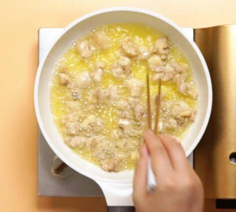 锅中放入食用油,烧至七成熟,放入鸡块,小火炸至金黄。