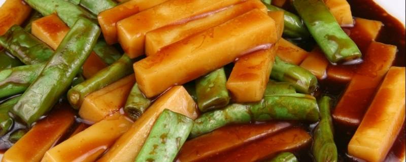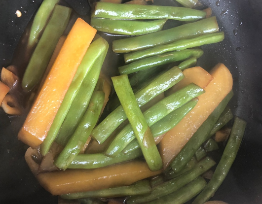 热锅冷油,下蒜瓣炒香后下土豆条炒至微微焦黄,下刀豆翻炒均匀。