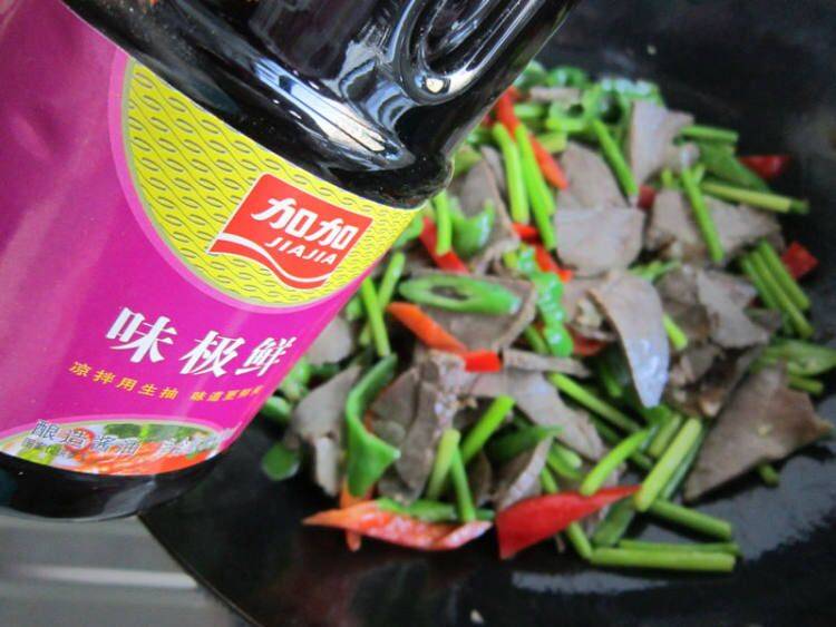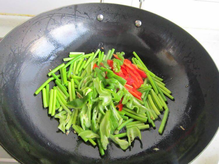 1、食材准备:蒜薹、卤牛肉、植物油、盐、姜、青红辣椒、味极鲜、鸡精。