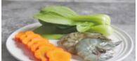 胡萝卜去皮切成片、青菜清洗干净、基围虾去掉虾线虾须。