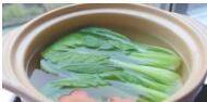 锅里烧开水,加入青菜、胡萝卜焯熟水捞出备用(锅里加一点盐和食用油,这样蔬菜颜色更鲜艳)。