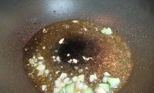 锅烧热倒入适量的油烧热,牛肉粒和蒜末放入爆香。