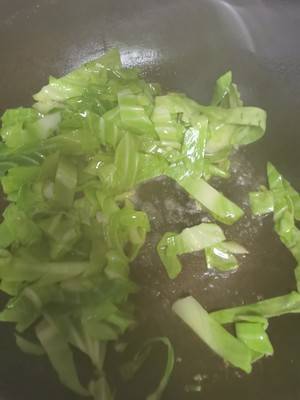 2、把包菜叶子切条,锅中放油,炒包菜叶子2分钟。