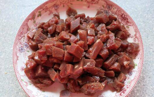 1、将牛排切成1.5cm的粒。