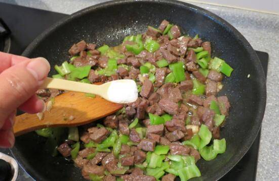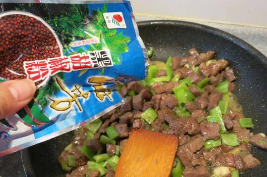 8、放入青椒丁翻炒,待肉丁7成熟时。