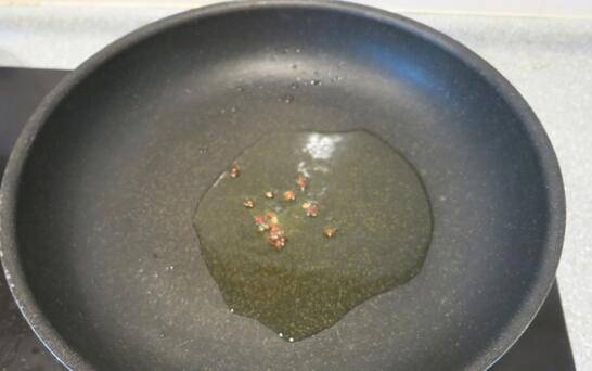 4、热锅凉油,放入适量的植物油,丢几粒花椒爆香。