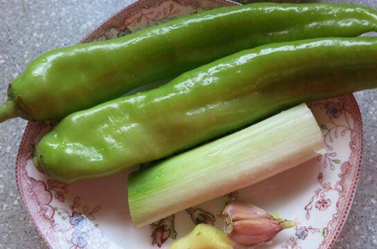 用料:牛排2块、青椒2只、葱节1段、鲜姜7克、大蒜2瓣、盐少许、黑胡椒粉少许、花椒粒少量、油适量。