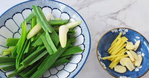 2、蒜切末,姜切丝,大葱切寸段备用。