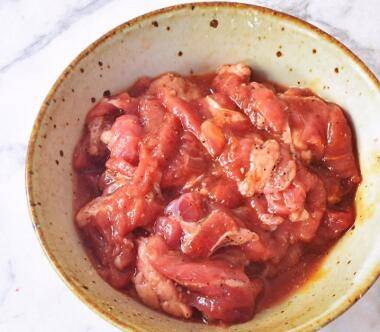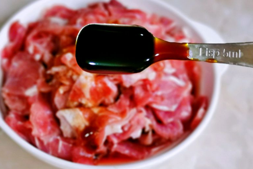 1、牛肉片洗干净,将血水挤出,放入盘中,加入料酒,加入生抽,加入蚝油,戴上食品手套抓拌均匀。