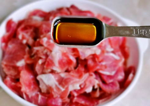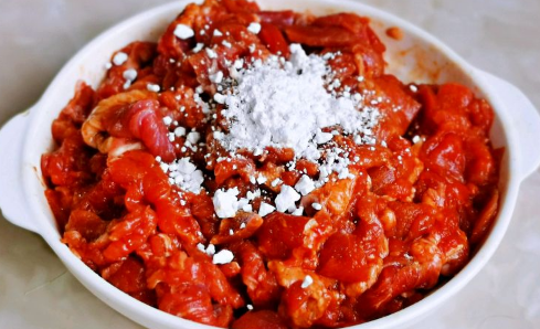 3、加入淀粉,最后淋上一勺食用油,有效锁住牛肉的水分,盖上盖子,放入冰箱冷藏腌制30分钟。