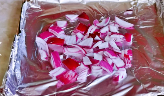 4、洋葱去皮切小块,放入垫好锡纸的烤盘中。