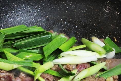 4、加入牛肉爆炒至变色变白,加入大葱翻炒至断生。