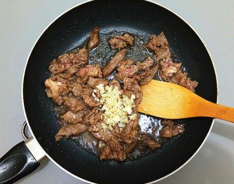 6、炒至牛肉刚刚变色,加入切好的蒜末炒出香味。