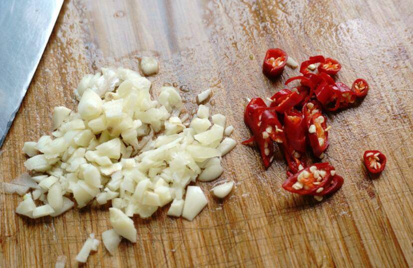 3、大蒜瓣切碎,辣椒切碎备用。