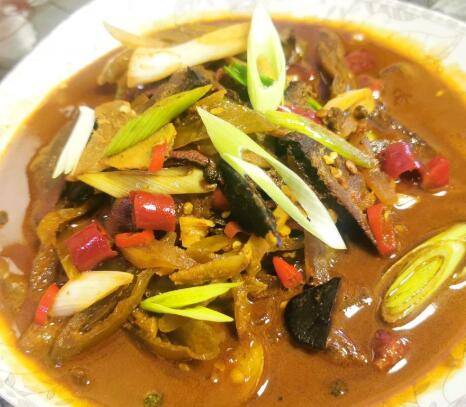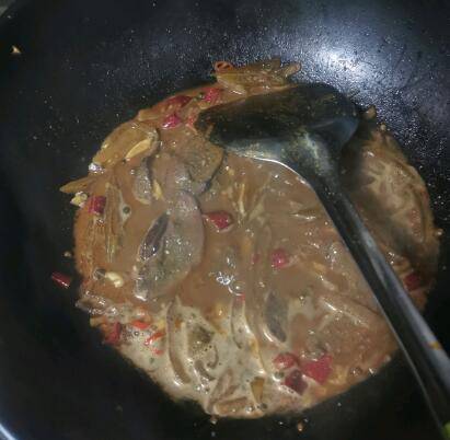 2、锅中放油烧开,放入花椒生姜大蒜,倒入泡好的猪肝翻炒,加料酒去腥。