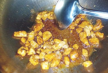 锅中留少许底油,倒入鸡丁煸炒;