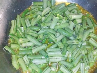 锅烧热倒入适量的油,油温八成热时下入豆角炸软;