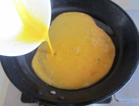 锅内加植物油烧到油冒烟,倒入蛋液摊成鸡蛋块,盛出备用。