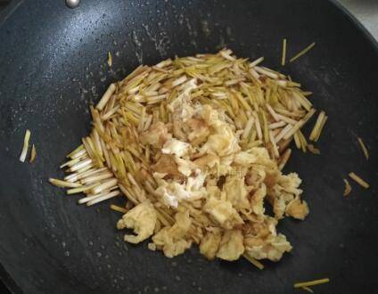 大火翻炒至蒜黄刚一打蔫,加盐调个味。倒入鸡蛋翻炒均匀即可出锅。