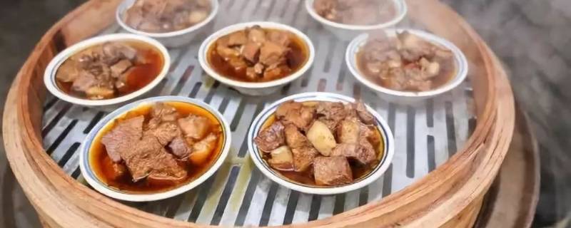 蒸碗有小酥肉、条子肉、黄焖鸡、粉蒸肉、四喜丸子、带把肘子、梅菜扣肉和八宝甜饭等。