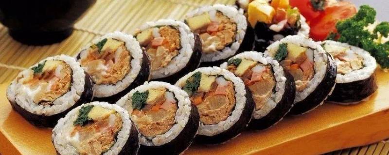 紫菜包饭材料有锡纸、薄片紫菜、熟糯米饭、蛋饼、胡萝卜、黄瓜、肉松、蟹肉柳、火腿、香肠、白糖、白醋、盐、白芝麻、芝麻油、沙拉酱、番茄酱、菠菜、海苔、寿司帘、虾仁、生菜、黑米、红豆等。