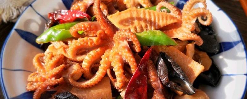 7、将处理好的八带下锅,再下入笋干和木耳。