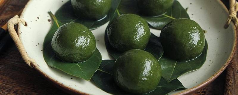 2、艾草煮至软烂,分几次加入糯米粉中,用刮刀拌匀,再揉几分钟。取一小块面团,包入适量豆沙馅,用力搓成丸子。