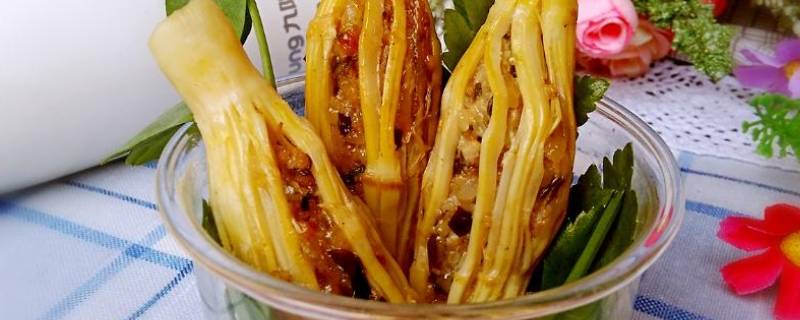 2、酿竹笋:先将竹笋剥净过水,切成两半,然后把肉丝、冬茹、葱等和成肉末酿进笋内,用蒸笼蒸熟或用油锅煎成,鲜甜脆嫩。
