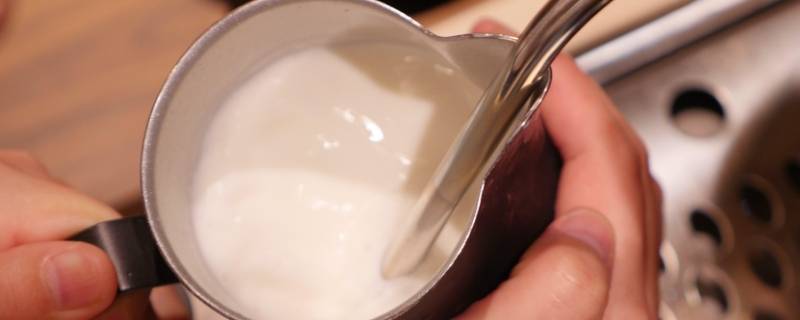 第二步:打绵,打绵就是将发泡后牛奶,利用漩涡的方式绻入空气,并使较大的奶泡破裂,分解成细小的泡沫,并让牛奶分子之间产生黏结的作用,使奶泡组织变得更加绵密。在市面上的牛奶发泡方式有很多种,不过大致上分为两大类,一种为边打发边打绵,就是打发牛奶跟打绵牛奶泡的阶段结合在一起。另一种为打发、打绵的阶段分开,也就是先打发牛奶再打绵牛奶泡。牛奶在打发的时候我们要使用蒸汽让其尽快旋转并且形成一个小漩涡。这样可以把比较粗的奶泡卷入牛奶中,使牛奶在打发后有绵密的状态。