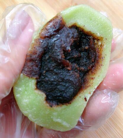 8、取块面团搓圆按扁,手掌可以微微弯曲,放入豆沙,可以用虎口收口,或者用你喜欢的任何方式。