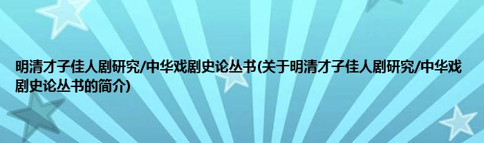 大家好,明清才子佳人剧研究/中华戏剧史论丛书,关于明清才子佳人剧研究/中华戏剧史论丛书的简介很多人还不知道,现在让我们一起来看看吧!
