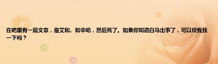 大家好,小常来为大家解答以上问题。在吧里有一篇文章,是艾和、和辛屹,然后死了。如果你知道白马出事了,可以帮我找一下吗?很多人还不知道,现在让我们一起来看看吧!