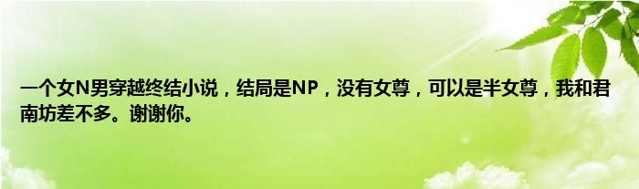 大家好,小常来为大家解答以上问题。一个女N男穿越终结小说,结局是NP,没有女尊,可以是半女尊,我和君南坊差不多。谢谢你。很多人还不知道,现在让我们一起来看看吧!