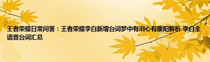 今天来聊聊关于王者荣耀日常问答:王者荣耀李白新增台词梦中有泪心有暖阳解析,李白全语音台词汇总的文章,游戏是很多人的选择,但是游戏玩多了也会身心疲惫,现在就为大家来简单介绍下王者荣耀日常问答:王者荣耀李白新增台词梦中有泪心有暖阳解析,李白全语音台词汇总,希望对各位小伙伴们有所帮助。