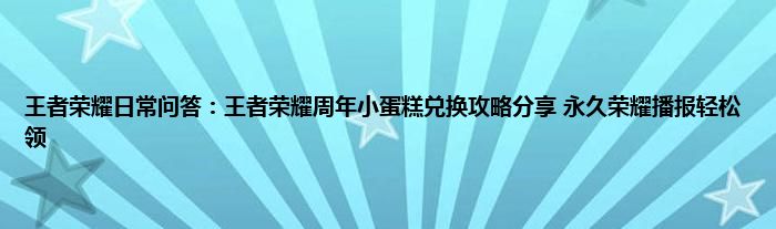 今天来聊聊关于王者荣耀日常问答:王者荣耀周年小蛋糕兑换攻略分享,永久荣耀播报轻松领的文章,游戏是很多人的选择,但是游戏玩多了也会身心疲惫,现在就为大家来简单介绍下王者荣耀日常问答:王者荣耀周年小蛋糕兑换攻略分享,永久荣耀播报轻松领,希望对各位小伙伴们有所帮助。