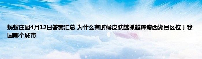 2021年4月12日蚂蚁庄园答案是什么?4月12日蚂蚁庄园的答案很多的玩家都不清晰,这两个问题有:为什么有时候皮肤越抓越痒?瘦西湖景区位于我国哪个城市?下面小编给大家介绍一下具体的答案和解析,一起来看看吧。