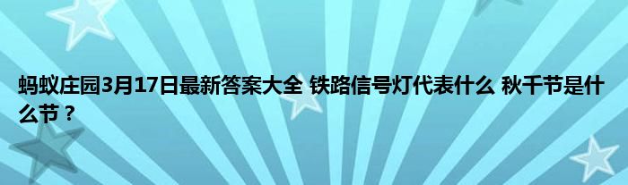 大家好,今天是3月17日,今天的蚂蚁庄园问题是铁路信号灯代表什么 秋千节是什么节?答对了问题可以获得奖励,那么具体答案是什么呢,小编收集和整理了有关内容,下面就跟着小编一起看看吧,希望能帮到大家。