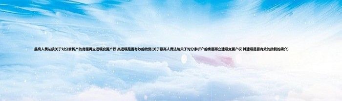 最佳答案大家好,最高人民法院关于对分家析产的房屋再立遗嘱变更产权,其遗嘱是否有效的批复,关于最高人民法院关于对分家析产的房屋再立遗嘱变更产权,其遗嘱是否有效的批复的简介很多人还不知道,现在让我们一起来看看吧! 《最高人民法院关于对分家析产的房屋再立遗嘱变更产权。其遗嘱是否有效的批复》在...