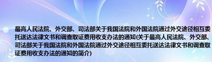 本文关于最高人民法院、外交部、司法部关于我国法院和外国法院通过外交途径相互委托送达法律文书和调查取证费用收支办法的通知的简介就讲解完毕,希望对大家有所帮助。